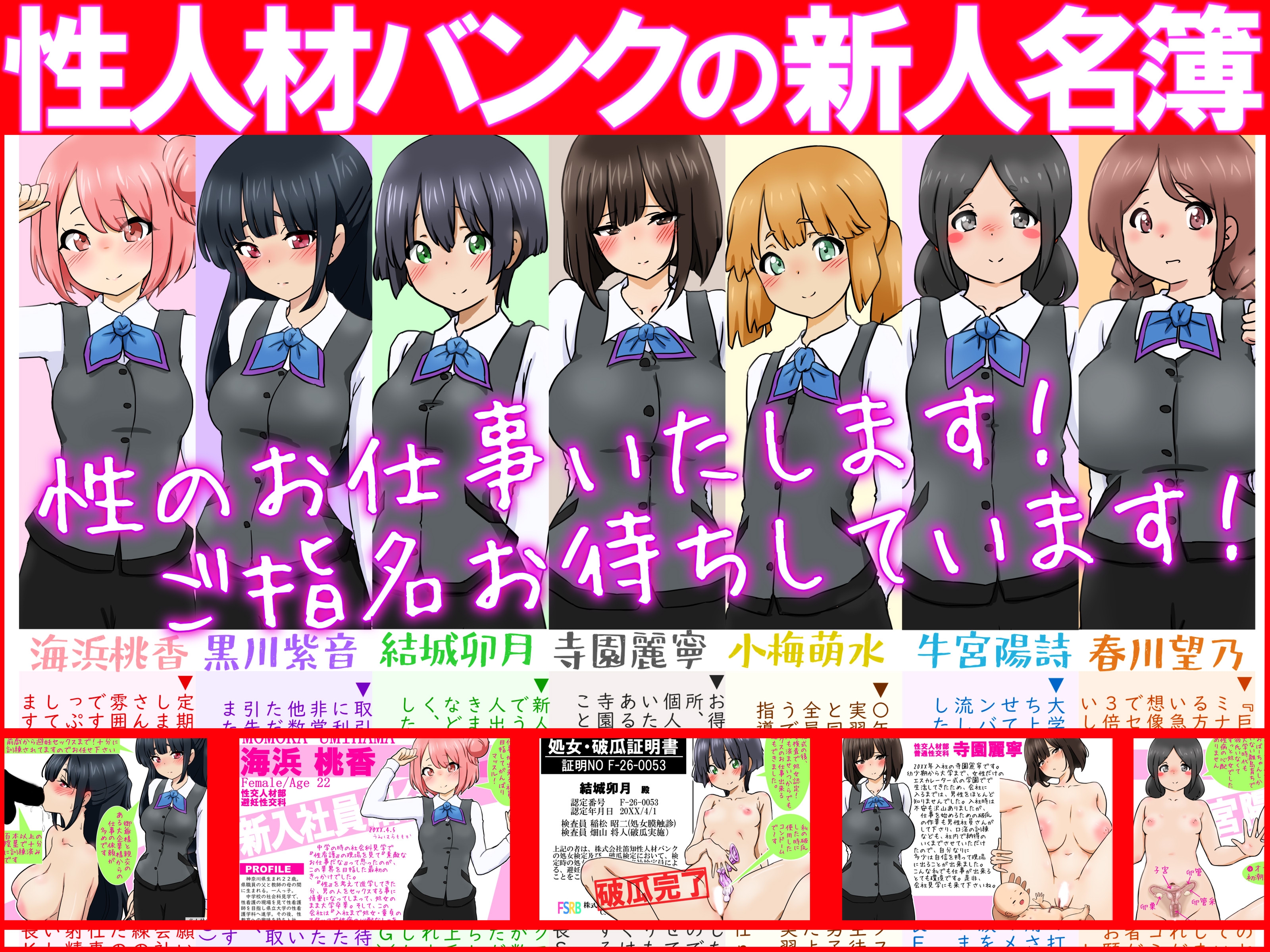同人サークル「ふぇちすぴ」様の作品です。 とある二次元の世界の民間性人材バンク…それは、性接待や性教育や社会人の性の研修、そのための人材を持たない学術機関や企業に人材を派遣する会社。