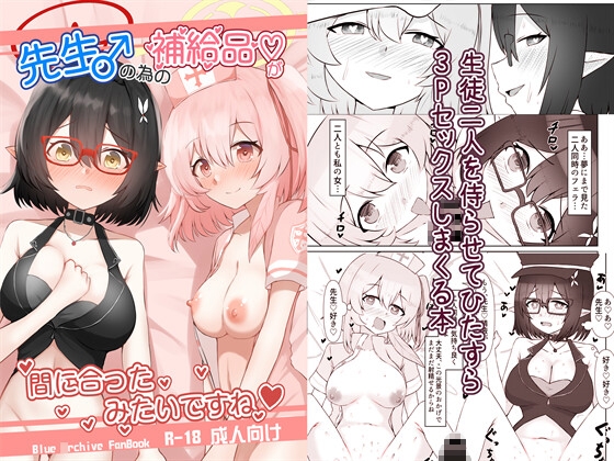 奥○アヤネがシャーレに訪れると、鷲○セリナが救護騎士団として先生の性処理当番をしているところに鉢合わせてしまって、なんやかんやあって3P乱交セックスしまくる本です。